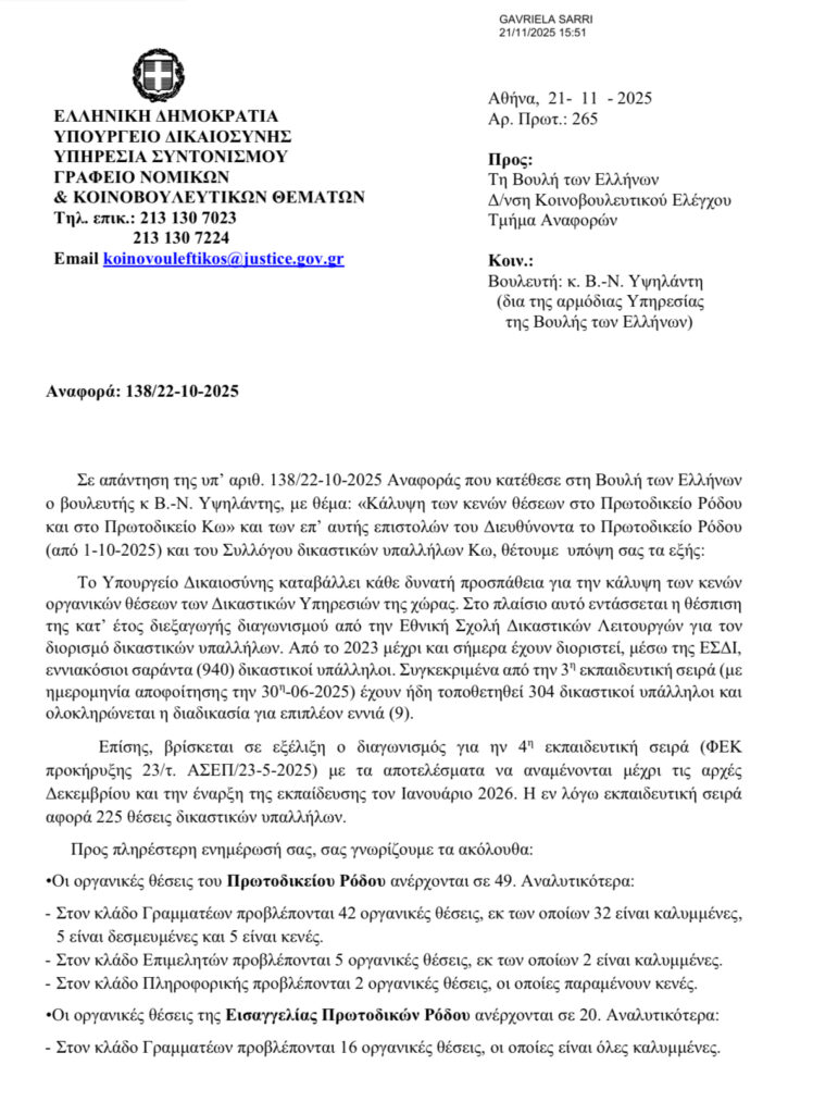 Σε απάντηση της υπ’ αριθ. 138/22-10-2025 Αναφοράς που κατέθεσε στηΒουλή των Ελλήνων ο βουλευτής κ Β.-Ν. Υψηλάντης, με θέμα: «Κάλυψη των κενών θέσεων στο Πρωτοδικείο Ρόδου και στο Πρωτοδικείο Κω» και των επ’ αυτής επιστολών του Διευθύνοντα το Πρωτοδικείο Ρόδου (από 1-10-2025) και του Συλλόγου δικαστικών υπαλλήλων Κω, θέτουμε υπόψη σας τα εξής:
