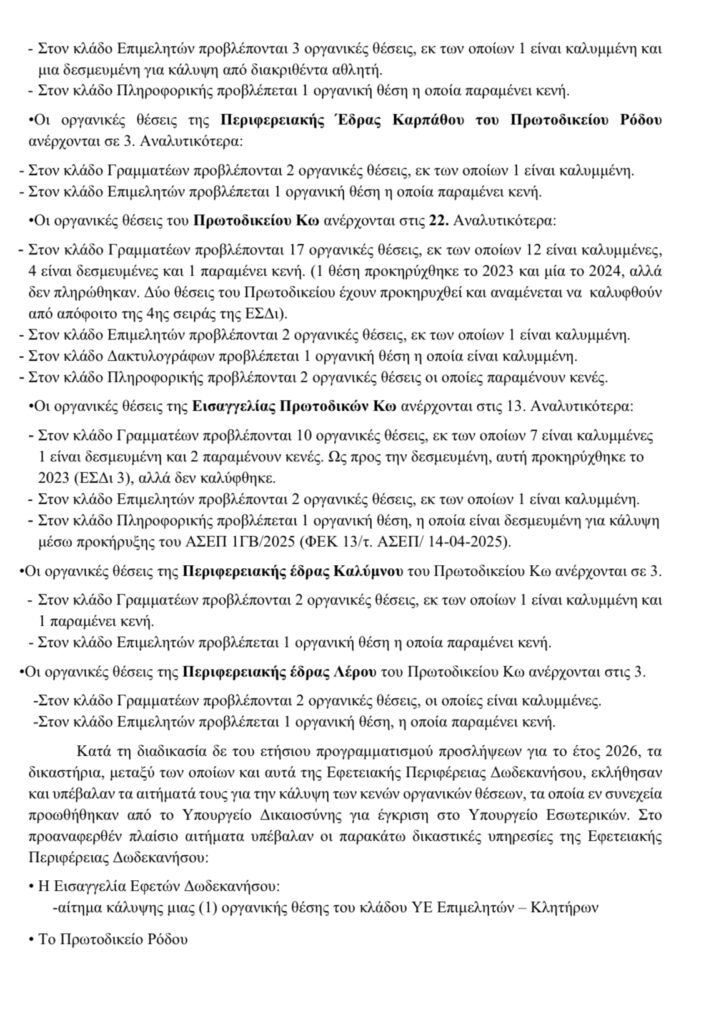 Κατά τη διαδικασία δε του ετήσιου προγραμματισμού προσλήψεων για το έτος 2026, τα δικαστήρια, μεταξύ των οποίων και αυτά της Εφετειακής Περιφέρειας Δωδεκανήσου, εκλήθησαν και υπέβαλαν τααιτήματά τους για την κάλυψη των κενών οργανικών θέσεων, τα οποίαεν συνεχεία προωθήθηκαν από το Υπουργείο Δικαιοσύνης για έγκριση στο Υπουργείο Εσωτερικών. Στο προαναφερθέν πλαίσιο αιτήματα υπέβαλαν οι παρακάτω δικαστικές υπηρεσίες της Εφετειακής Περιφέρειας Δωδεκανήσου: