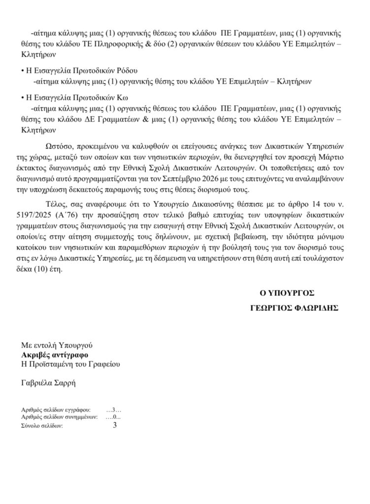 Για την άμεση αντιμετώπιση των αναγκών –ιδιαίτερα σε νησιωτικές και παραμεθόριες περιοχές όπως η Ρόδος, η Κως, η Κάρπαθος και η Λέρος– το Υπουργείο Δικαιοσύνης προχωρά στη διενέργεια έκτακτου διαγωνισμού από την Εθνική Σχολή Δικαστικών Λειτουργών (ΕΣΔ).
