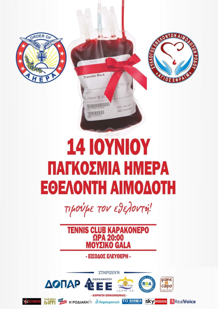 Το Τμήμα ΑΧΕΠΑ (HJ-33) Ρόδου και ο Σύλλογος Εθελοντών Αιμοδοτών Ρόδου «Άγιος Εφραίμ» στα πλαίσια των εκδηλώσεων της ΠΑΓΚΟΣΜΙΑΣ ΗΜΕΡΑΣ ΕΘΕΛΟΝΤΩΝ ΑΙΜΟΔΟΤΩΝ, σας προσκαλούν στο ΜΟΥΣΙΚΟ GALA την Τρίτη 14 Ιουνίου και ώρα 20:00 στο TENNIS CLUB στο Καρακόνερο.