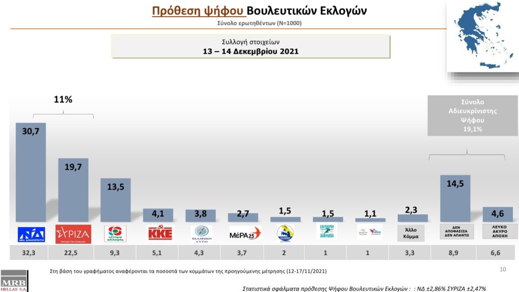 Στο 11% η διαφορά ΝΔ – ΣΥΡΙΖΑ στη δημοσκόπηση της MRB – Στο 13,5% το ΚΙΝΑΛ