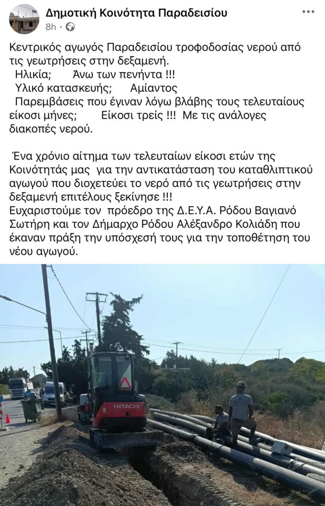 Ευχαριστούμε τον πρόεδρο της Δ.Ε.Υ.Α. Ρόδου Βαγιανό Σωτήρη και τον Δήμαρχο Ρόδου Αλέξανδρο Κολιάδη που έκαναν πράξη την υπόσχεσή τους για την τοποθέτηση του νέου αγωγού.