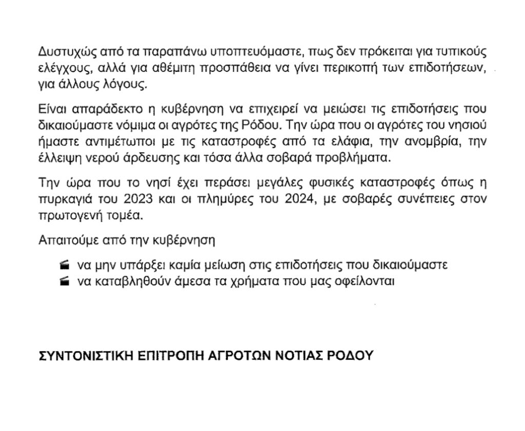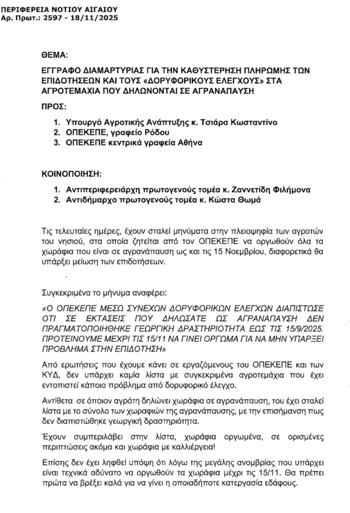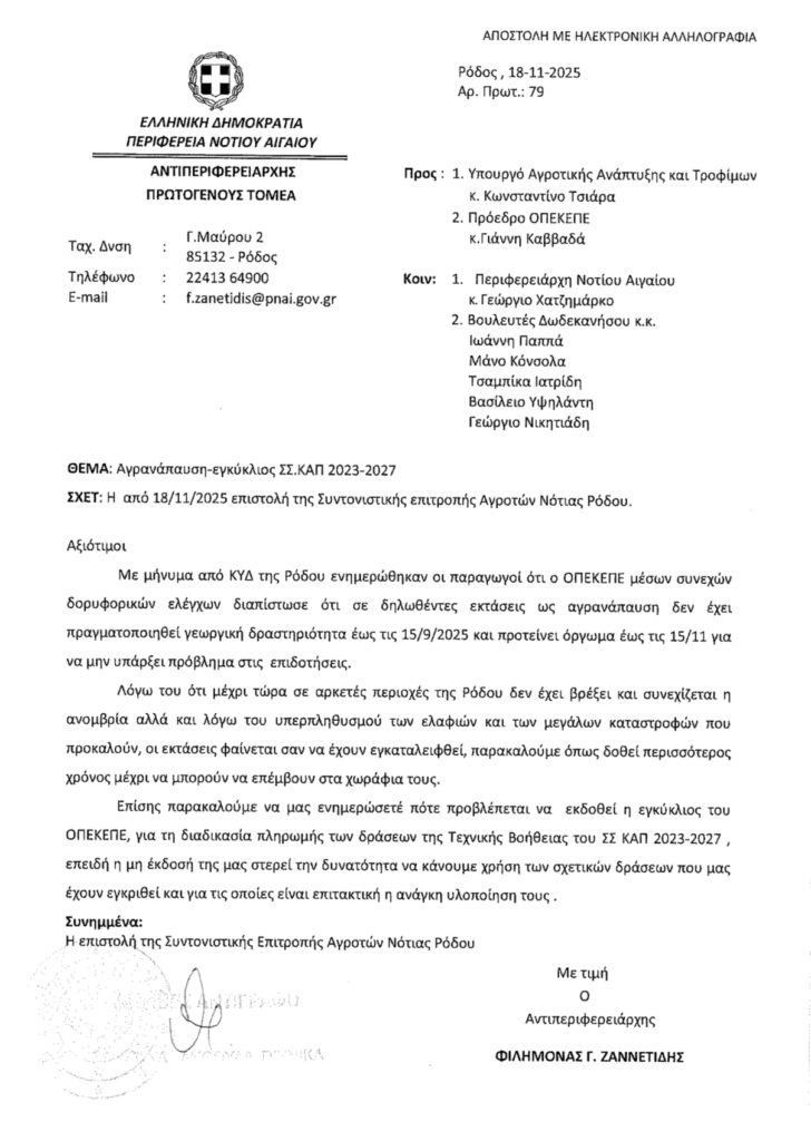 Ο Αντιπεριφερειάρχης τονίζει την ανάγκη άμεσης κινητοποίησης του Υπουργείου και του ΟΠΕΚΕΠΕ, προκειμένου να στηριχθεί ουσιαστικά ο αγροτικός κόσμος της Ρόδου σε μία περίοδο με αυξημένες δυσκολίες.